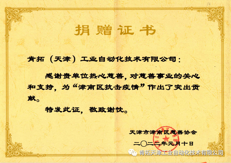 2022年3月16日,肯拓(天津)工業(yè)自動化技術有限公司收到來自天津市津南區(qū)慈善協(xié)會頒發(fā)的捐贈證書。