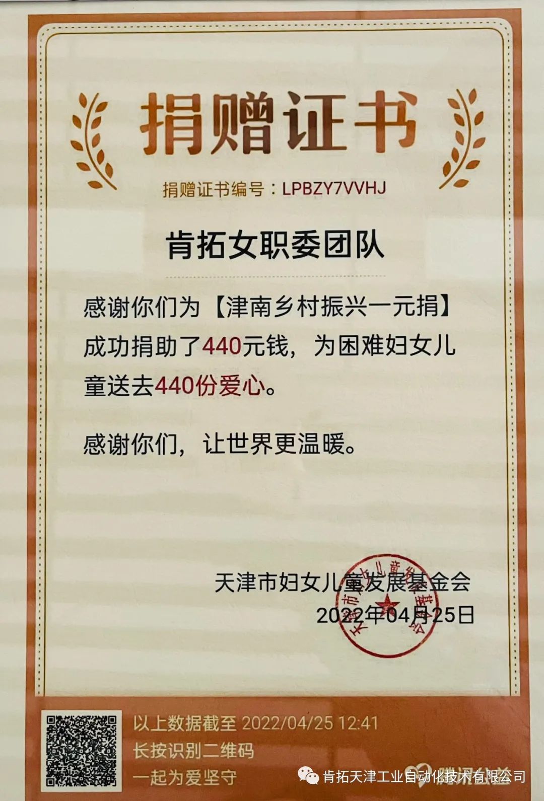 在日前由津南區(qū)婦聯(lián)組織開展的“津南鄉(xiāng)村振興一元捐”活動中,我公司廣大女員工積極響應(yīng)、踴躍參與,短短的兩天時間就完成捐款440元,在得到津南區(qū)及雙港鎮(zhèn)婦聯(lián)組織表揚的同時,獲得天津市婦女兒童發(fā)展基金會頒發(fā)的捐贈證書。