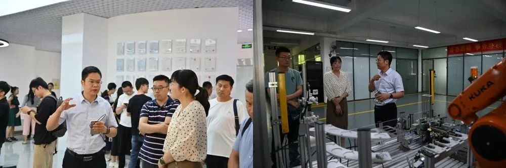 公司總經理助理、教育技術部經理平樂民接待并帶領來訪人員參觀了公司文化展廳及生產車間,介紹了公司發展背景、主要產品以及產教融合成果等方面的情況;參觀過程中,公司先進的工業機器人設備深深吸引了來訪人員,他們不時向工作人員詢問有關技術原理、設計理念、參賽經歷等內容,對公司企業文化、主導產品有了進一步了解。